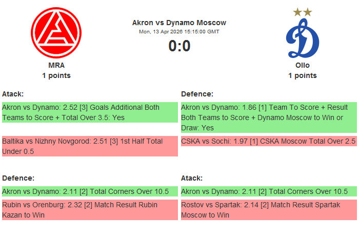 1.86 [1] Akron vs Dynamo: Team To Score + Result Both Teams to Score + Dynamo to Win or Draw: Yes